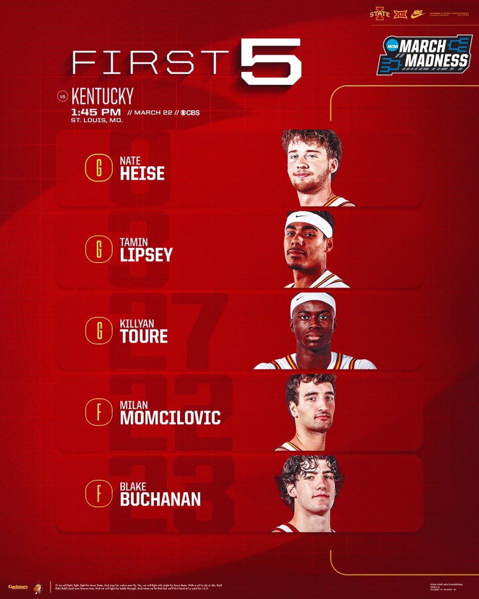 Iowa State Men’s Basketball@CycloneMBBWe will Face Kentucky Sunday at 1:45 p.m. (CT) on CBS. #Cyc...1 month ago•